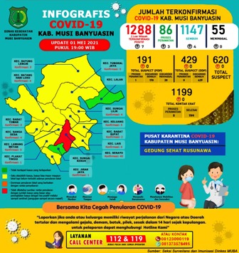 Sementara itu, berdasarkan data update Gugus Tugas Penanganan COVID-19 Muba 1 Mei 2021 tercatat ada sebanyak 429 ODP 429 selesai pemantauan 0 masih dipantau, 1.199 kontak erat 1.199 kontak selesai pemantauan 0 kontak erat yang masih dipantau, 191 PDP 1 proses pengawasan 190 selesai pengawasan.