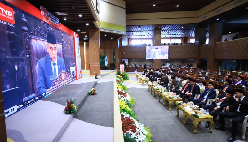 Meski tidak berada di Gedung Nusantara, suasana khidmat dan penuh penghormatan terasa di ruang sidang DPRD Sumsel. Semua peserta mengenakan pakaian resmi dan menyimak setiap rangkaian acara.