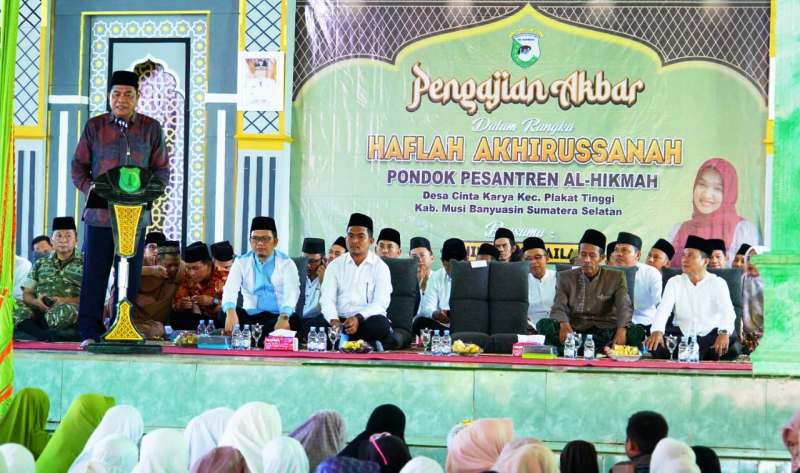 Divianews.com | Plakat Tinggi, Muba – Bupati Musi Banyuasin (Muba), H. M. Toha Tohet, menghadiri prosesi Haflah Akhirussanah dan Khatmil Qur’an santri Pondok Pesantren Al-Hikmah di Desa Cinta Karya, Kecamatan Plakat Tinggi, Minggu (12/04/2026). Kehadiran orang nomor satu di Bumi Serasan Sekate ini menjadi bentuk dukungan nyata pemerintah terhadap penguatan pendidikan karakter berbasis religi.